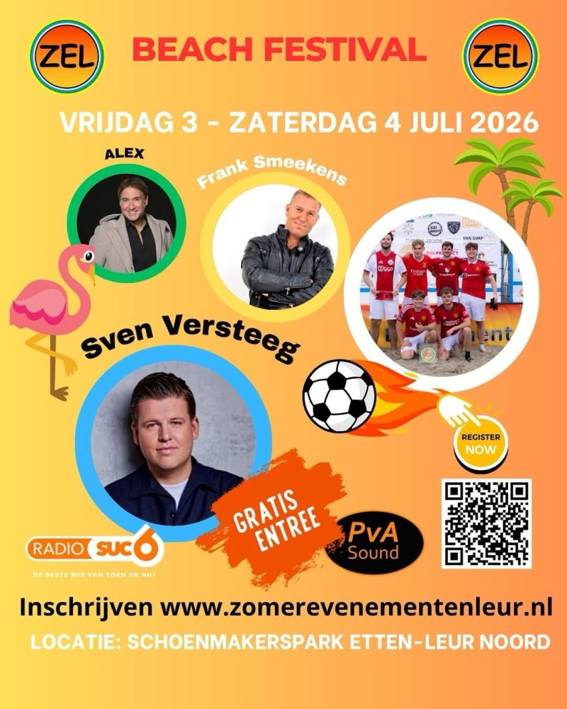 Op vrijdagavond 3 juli en zaterdag 4 juli 2026 organiseert Zomerevenementen Leur (ZEL) weer het Beachfestival met als hoofdactiviteit het Beachsoccer Toernooi voor bedrijven- en sponsorenteams en voor dames- , heren- en gemengde teams van alle leeftijden.