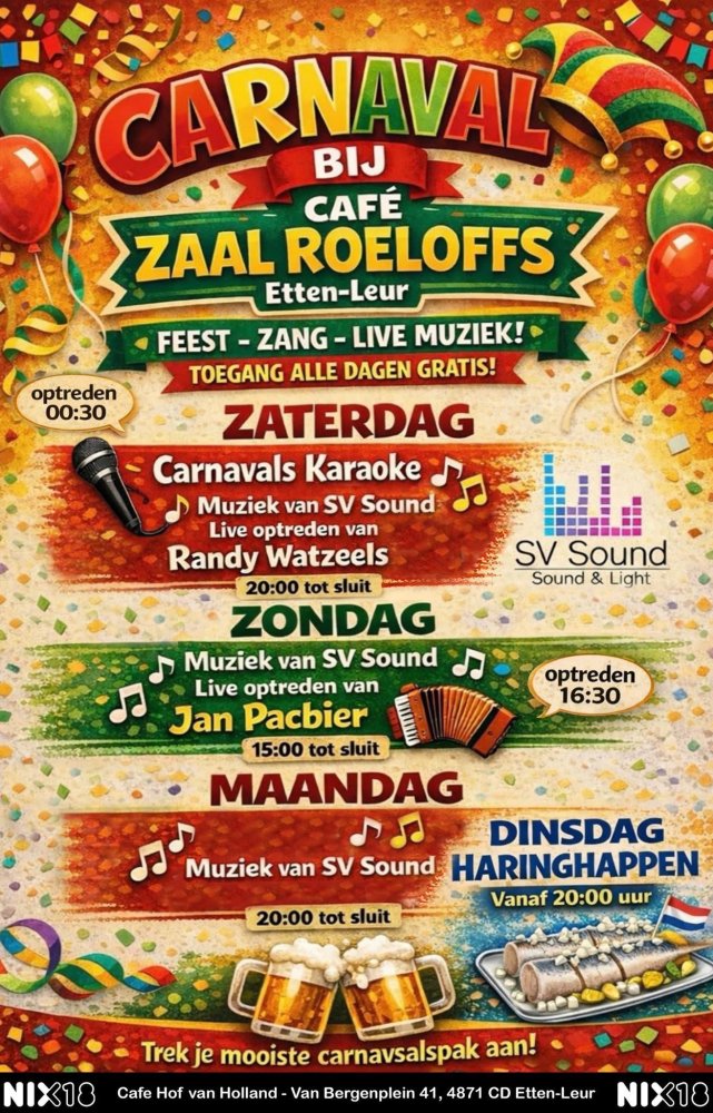Op zaterdag vanaf 20.00 uur: Carnavals Karaoke met SV sound. Om 00.30 uur een optreden van Randy Watzeels.