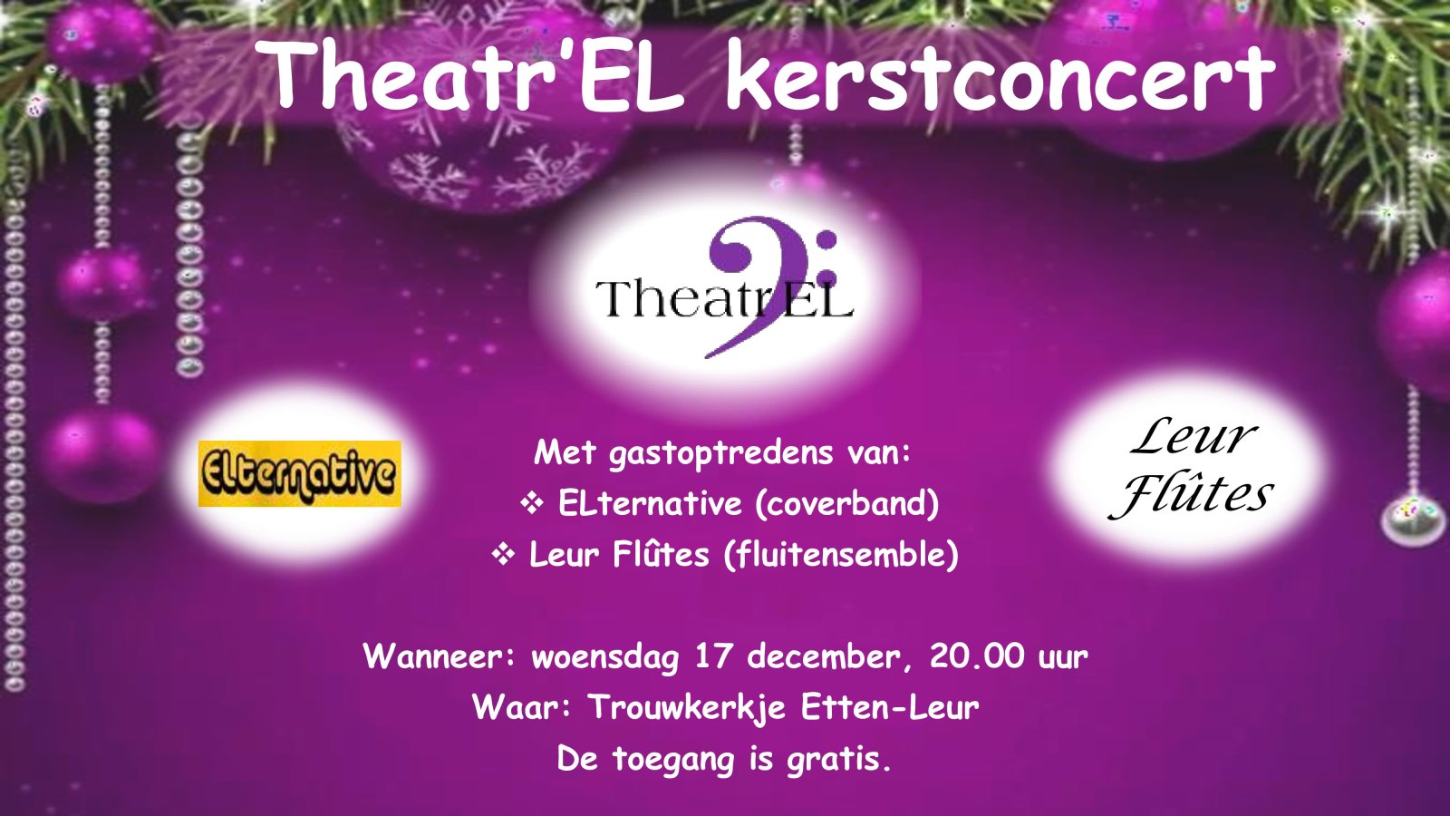 Zorg dat u erbij bent en geniet van de kerstsfeer in het mooie Trouwkerkje. Theatr’EL doet dit niet alleen, er zijn gastoptredens van de coverband ELternative en fluitensemble Leur Flûtes, beiden uit Etten-Leur. Uiteraard is ook de band aanwezig met René op drums en Gianluka op piano. En dit alles onder leiding van dirigent Rogier de Pijper.