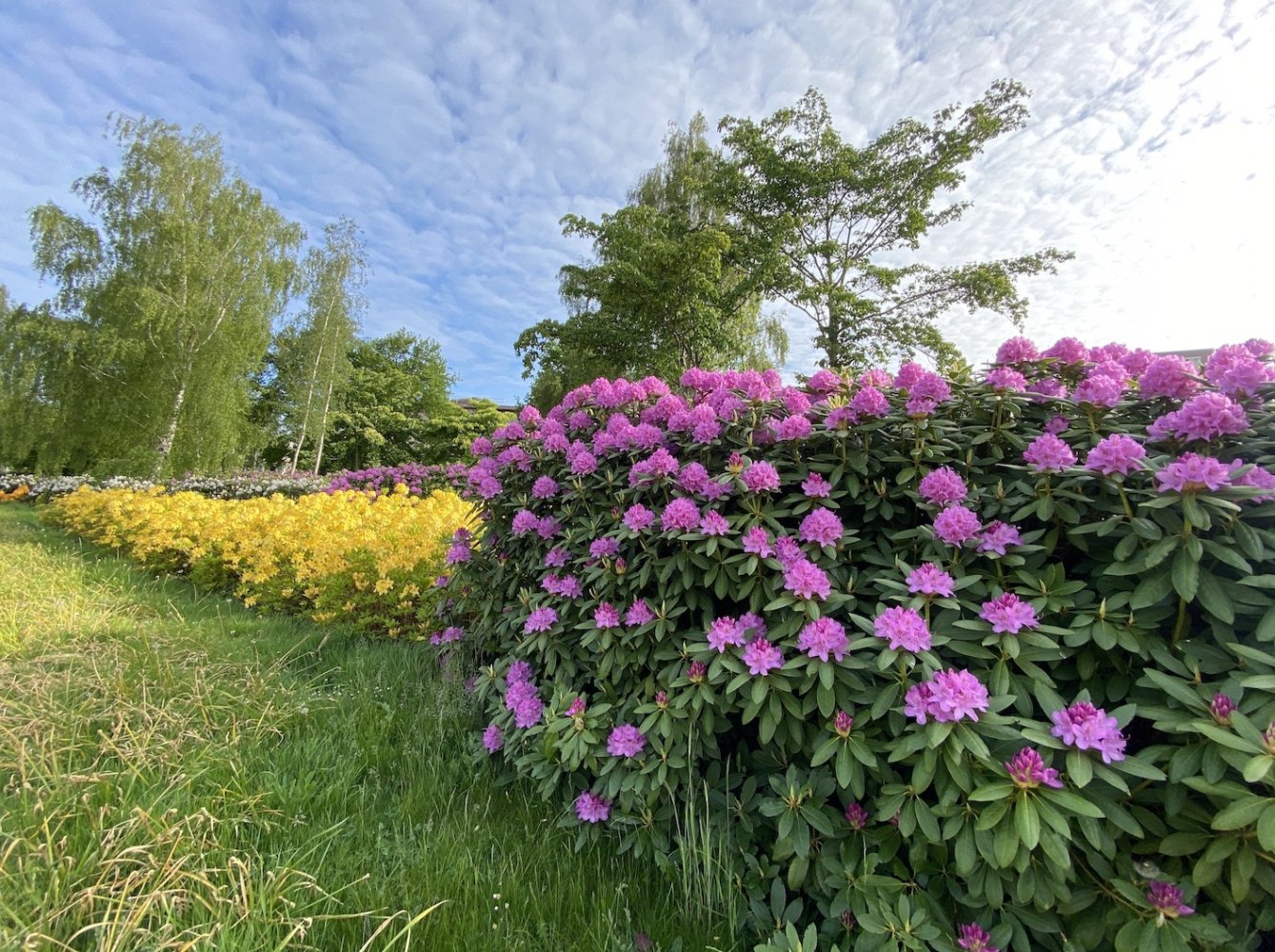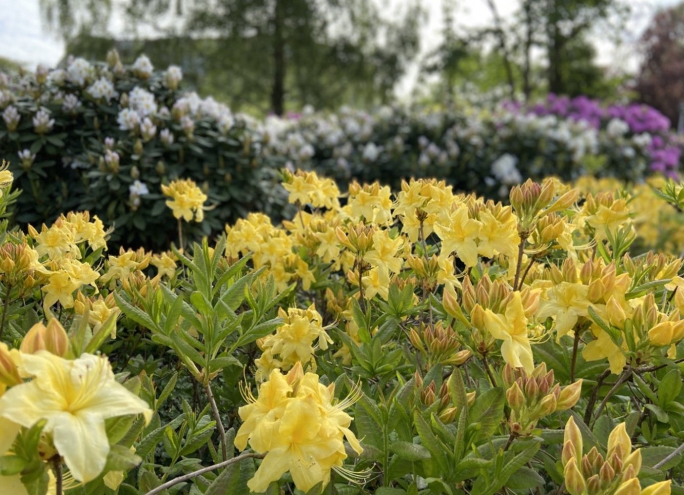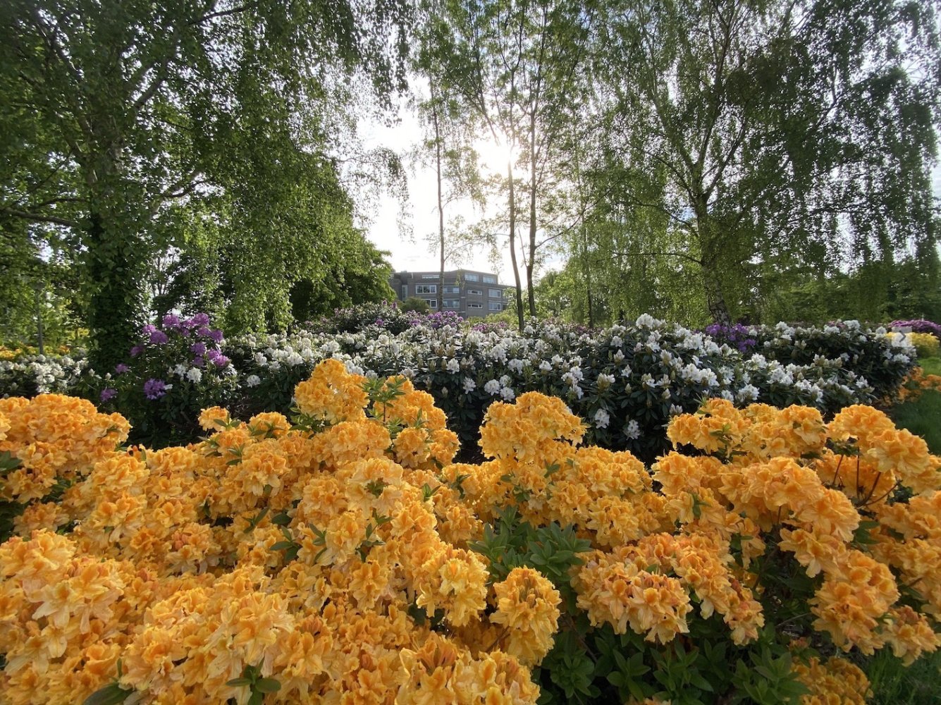 Iets meer tussen de appartementen tref je in het Brabantpark in de periode mei-juni ook een oase aan bloeiende rhododendrons. Ze hebben de allermooiste kleuren: diverse wit, geel, lila, oranje. Echt mooi om te zien!