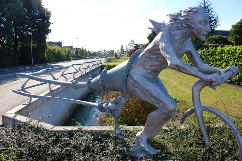 Het ontwerp van dit bijzondere 300 meter lange kunstwerk slaat op de thema’s werk en recreatie. Het hekwerk is zo geconstrueerd dat het golvend water uitbeeldt. Het begin en einde van het stalen hekwerk worden gemarkeerd door abstracte fietsers, gegoten uit aluminium. Ze volgen het fietspad en beelden het thema recreatie uit. De onderbrekingen van de abstracte waterstroom bij de uitritten van de bedrijven staan voor het thema werk. Op de hoeken van de Klompenmakerstraat zijn abstracte fonteinen geplaatst om zo het belang van het water uit te beelden. Het ontwerp is van Tijmen Smit. Sinds de plaatsing in 2013 worden de fietsers door onbekenden voorzien van passende kledij. Dit gebeurt meestal rond Carnaval, Pasen, Koningsdag, Halloween en Kerstmis. Lees verder