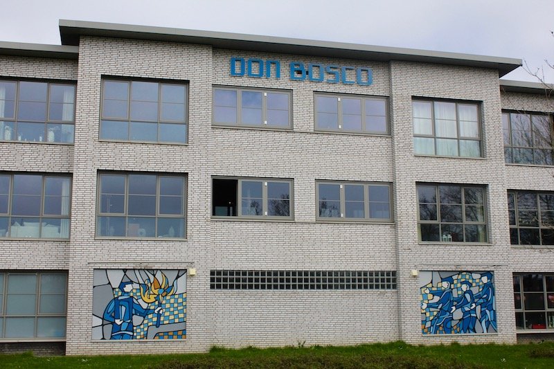 Deze muurschildering uit 2013-2014 van Mario Pasetto (1975) en Stijn de Wilde (1976) refereert aan het gevelmozaïek dat zich op deze plek ooit boven de hoofdingang van de technische school Don Bosco bevond. De schildering toont Don Bosco, een Italiaanse priester met een groot hart voor jongeren, die de fakkel van kennis en verantwoordelijkheid overdraagt aan de jeugd. Lees verder
