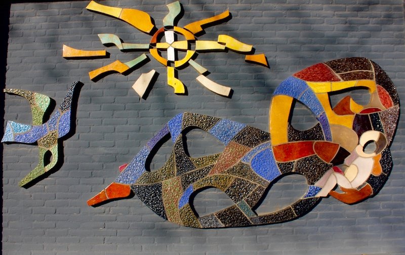 Een kenmerkende kunstuiting van de Etten-Leurse kunstenaar Jan van den Brink (1919-1993). De grote geabstraheerde hoofdfiguur stelt een moeder voor. Ze omarmt met veel zorg en liefde haar baby. Een goede lichamelijke en geestelijke gezondheid maakt mensen sterker, minder afhankelijk en vrijer van geest. Dat symboliseert de vliegende duif. Wie hulp nodig heeft, kan altijd een beroep doen op het ‘kruiswerk’. Zodat de zon weer doorbreekt. In 1964 werd dit gebouw opgericht als kraamcentrum, wijkgebouw en Wit-Gele Kruisgebouw. Het kruis centraal in de zon van het kunstwerk.