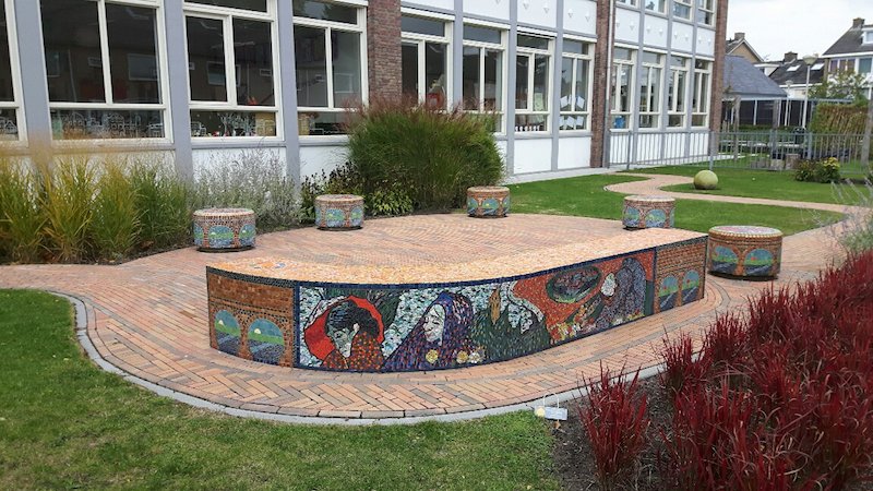 In de voortuin van basisschool IKC De Vincent staan poefjes en een bankje, bekleed met enkele duizenden stukjes mozaïek. Het kunstwerk is een creatie van Irene Hemelaar (1966). De motieven op de bank verwijzen naar Vincent van Goghs schilderij ‘Herinnering aan de tuin in Etten’. De wereldberoemde kunstenaar schilderde het in 1888 in Arles (F), nadat bevriend kunstschilder Paul Gauguin hem had uitgedaagd met de woorden ‘...jij kunt alleen maar schilderen wat je werkelijk ziet’. Het gevolg was een van Vincents meest expressieve werken ooit: een kleurrijke tuin met daarin zijn moeder en zijn zus Wil. Lees verder