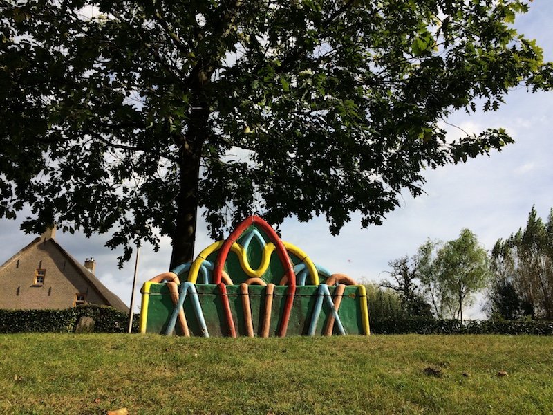 Dit kleurrijke bankje lijkt een dialoog aan te gaan met de vijver. Kijk je er van een afstandje naar, dan spiegelt het bankje zich in het water. Het is een kunstwerk van de Spaans-Nederlandse Dora Dolz (1941-2008), bekend om haar keramische buitenbeelden in de vorm van stoelen en banken. Weelderige, wulpse vormen en zwierige kleuren kenmerken haar werk. Lees verder
