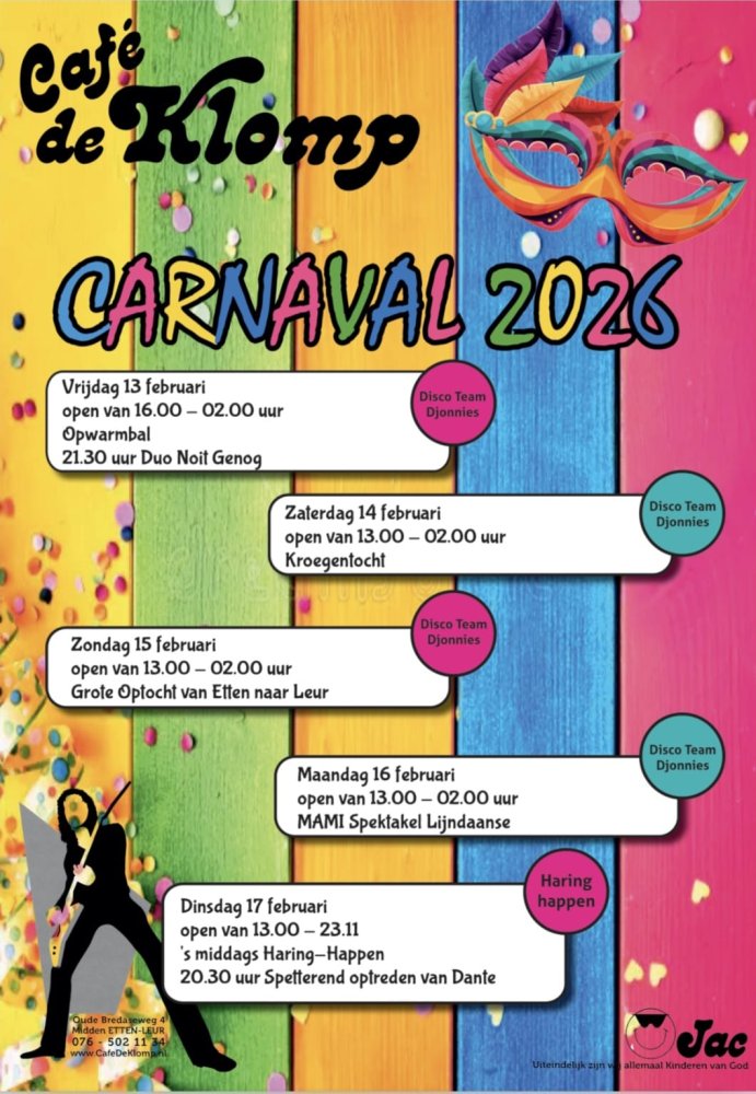 Van donderdag 12 februari t/m dinsdag 17 februari 2026 kun je in Etten-Leur weer volop Carnaval vieren.