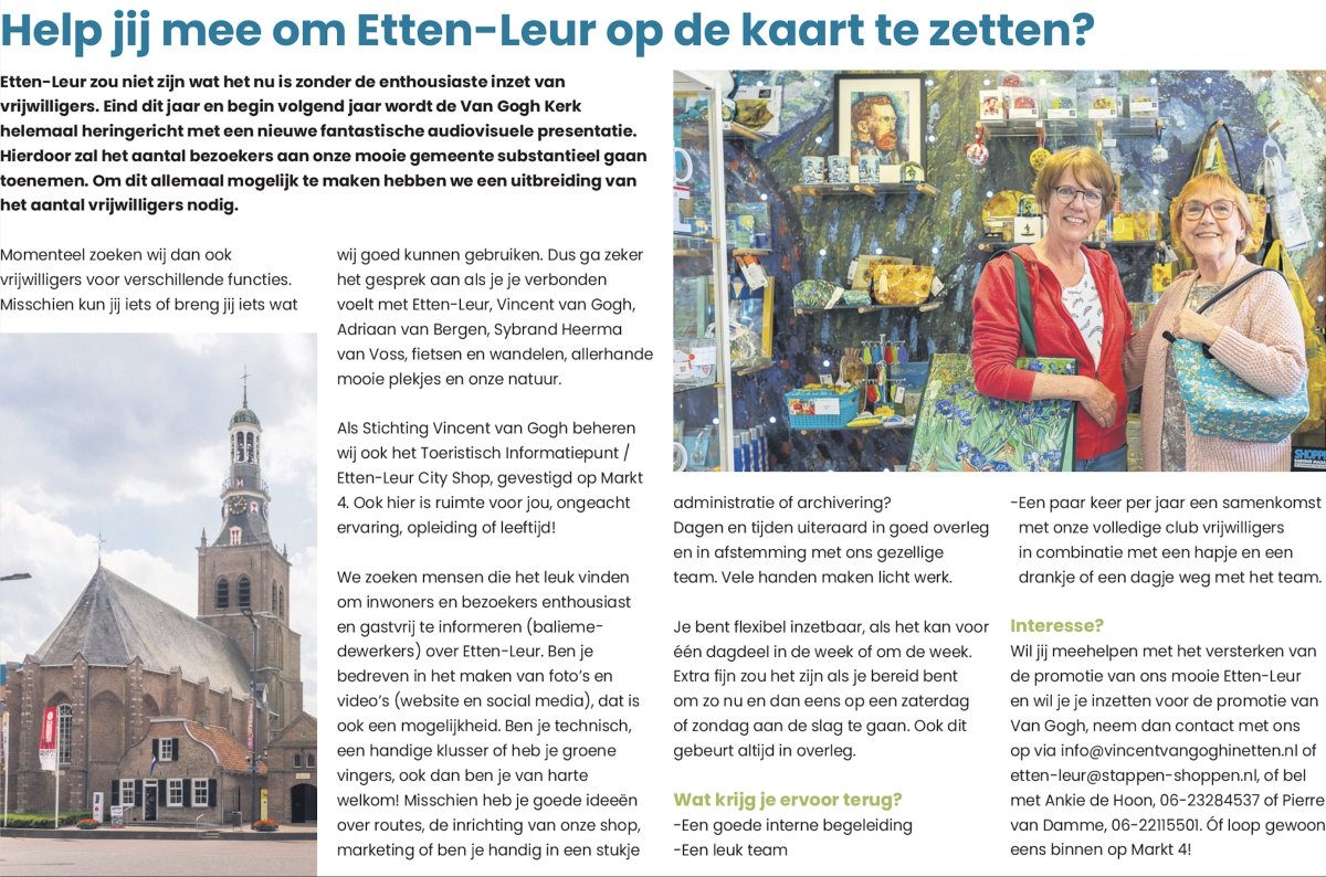 De Etten-Leur City Shop draait volledig op vrijwilligers, locals die Etten-Leur goed kennen en inwoners en bezoekers zo goed en vriendelijk van dienst willen zijn. Heb jij interesse om Etten-Leur mee te promoten, stuur dan vrijblijvend een berichtje naar info@vgel.nl of loop gewoon even binnen op Markt 4. We kunnen vooral nog mensen gebruiken die bijvoorbeeld 1 keer in de maand op zaterdag en/of zondag in de shop mee willen draaien. Stuur ons een berichtje als je interesse hebt, of loop even binnen in de shop.