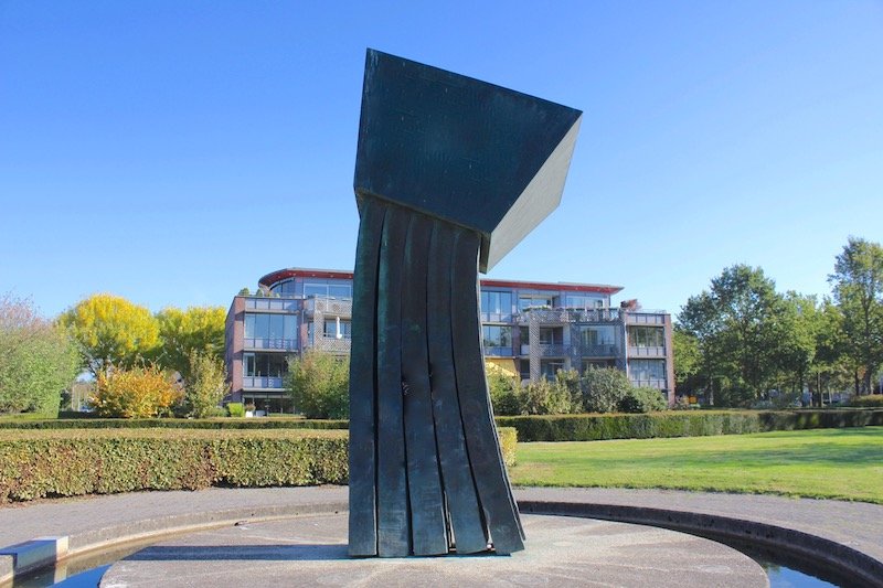 Dit beeld straalt als het ware twee houdingen uit. Die houden het midden tussen een labiel evenwicht en een elegant gebaar. Het bronzen beeld bestaat uit een rechthoekig, dikwandig bassin waaruit een bussel kolommen lijkt te stromen. Dit symboliseert het samenvloeien van energiestromen. De schuine stand van het bassin geeft het beeld een sterk ruimtelijke werking. Het is gemaakt door Niko de Wit (1948) en onthuld in 1993. Lees verder