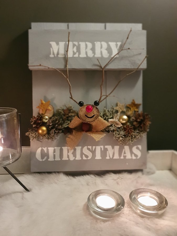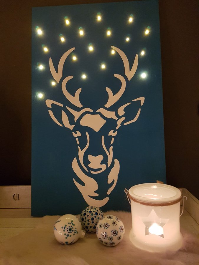 -Rendier sfeerbord met lampjes. Eerst het bord verven, gaatjes boren en daarna het rendier er op zetten.