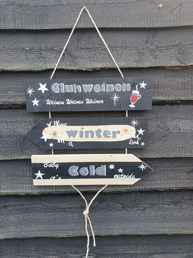 -Kerstwijzer. Bijvoorbeeld voor aan of bij de voordeur. Je gaat de plankjes zelf verven en zorgvuldig de tekst erop zetten. Met een beetje hulp kan iedereen het!