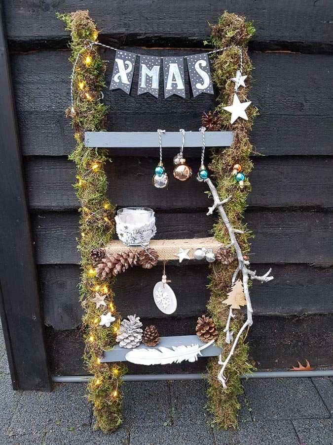 -Kersttrapje. Eerst het trapje verven, daarna met mos bekleden, de lampjes aanbrengen en daarna naar eigen wens verder pimpen.