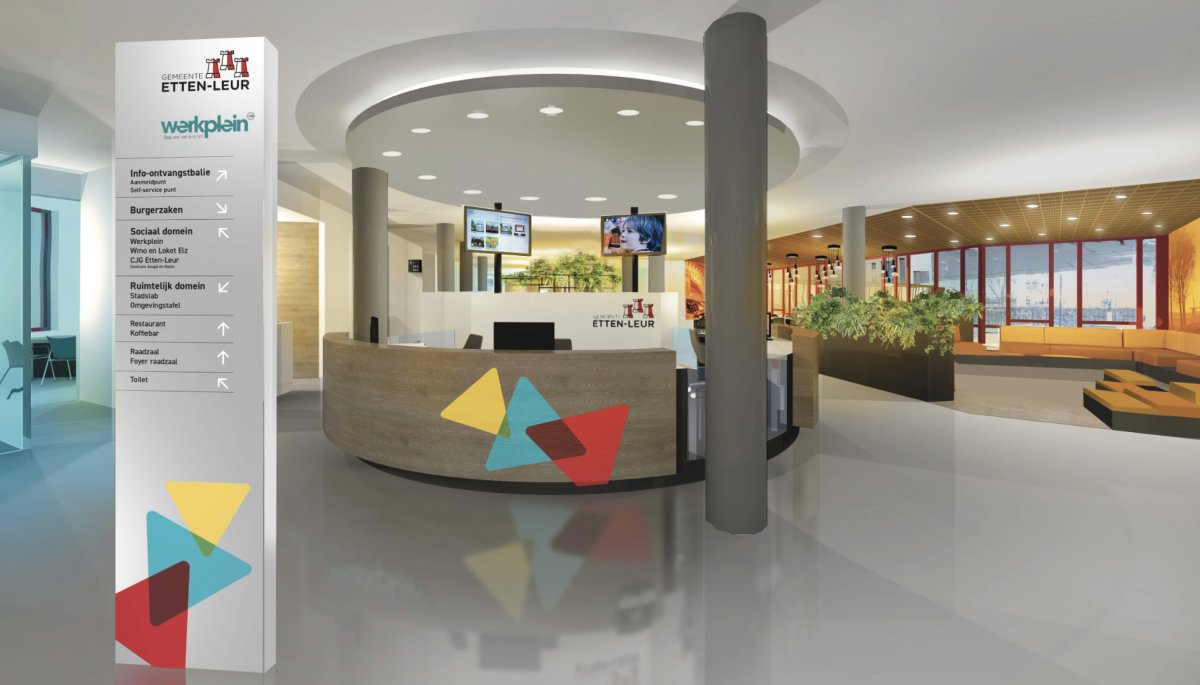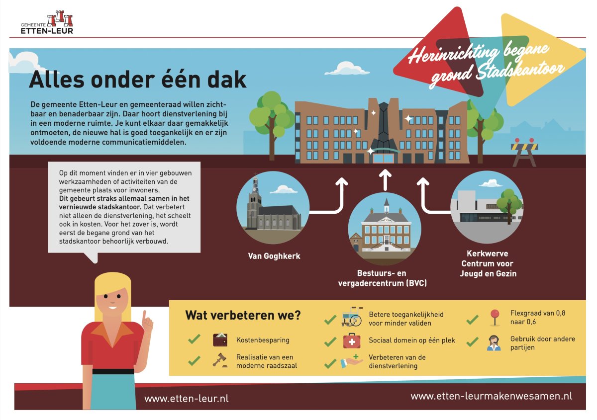 Aan de Raadhuispleinzijde van het Stadskantoor wordt een 'ontvangstplein' gerealiseerd met een grote ronde balie. Hier worden ook enkele zitjes geplaatst. Niet alles zal en hoeft nieuw te zijn. Integendeel: bestaande materialen en attributen worden zoveel mogelijk hergebruikt. De huidige spreekkamers krijgen meer sfeer en moeten inwoners het 'huiskamergevoel' geven. Verder zijn onder andere diverse vergaderruimtes voorzien (het BVC vervalt immers), een koffiehoek, genderneutrale toiletten en een stadslab waarin de ruimtelijke ontwikkelingen van Etten-Leur samenkomen.