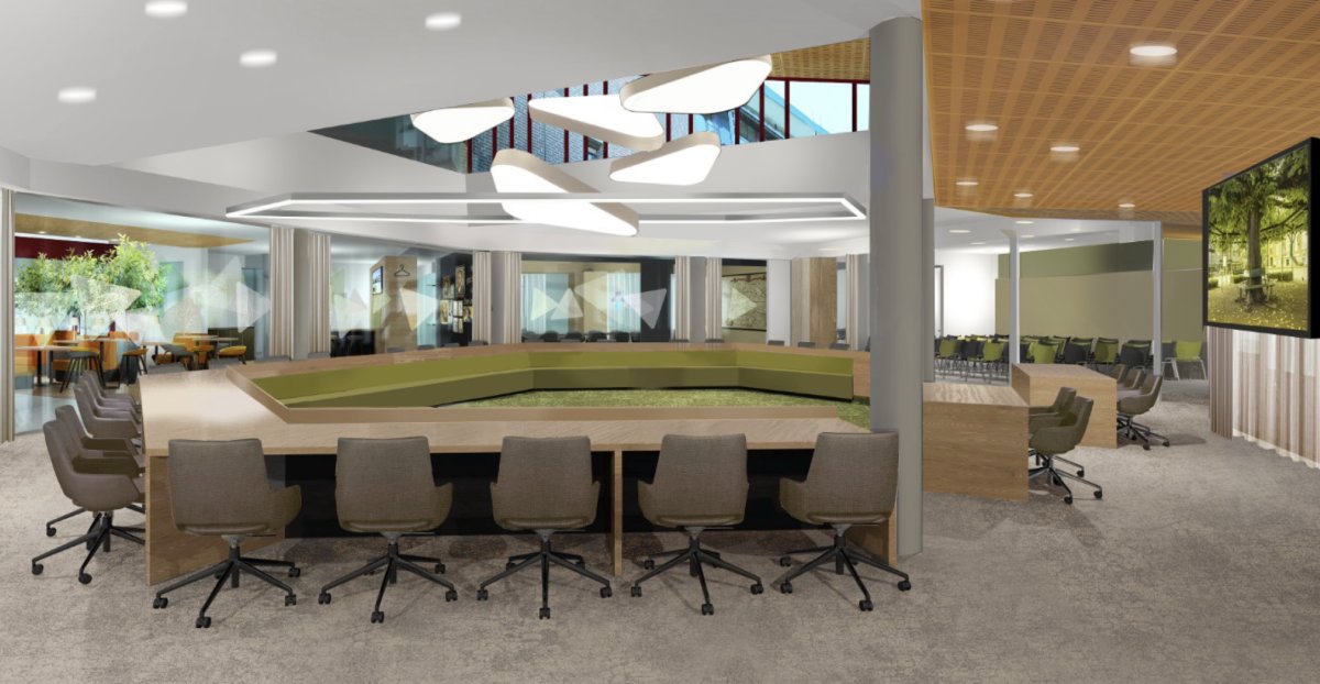 Een sfeerimpressie van de foyer aan de zijde van de Roosendaalseweg, met zicht op de Raadzaal.