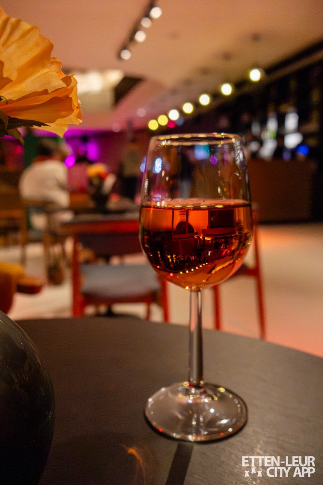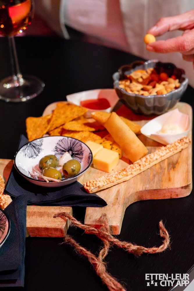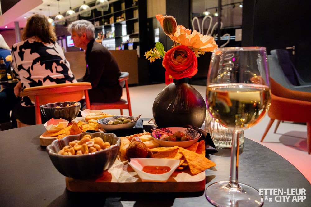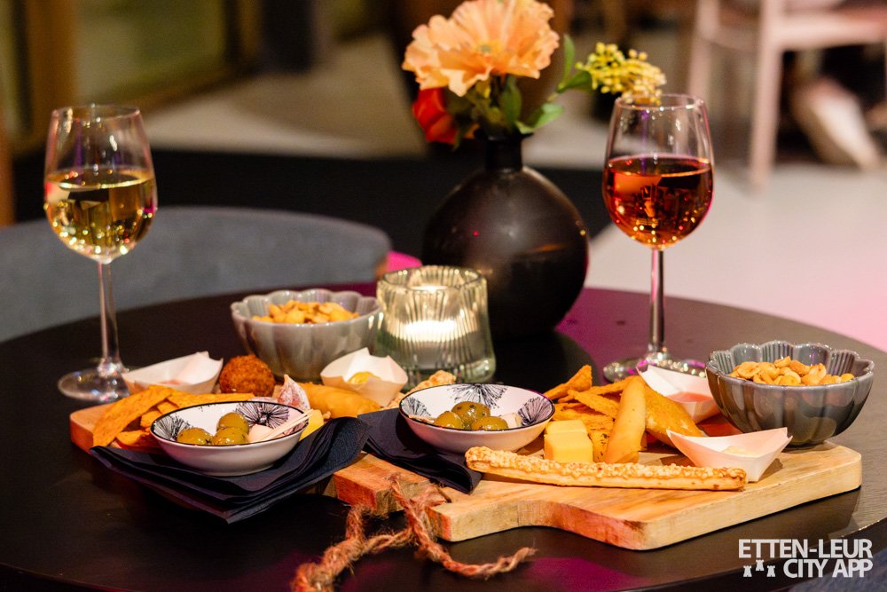 Na de voorstelling verlaten wij de zaal met een glimlach op ons gezicht. We melden ons opnieuw bij de borrelbalie. Daar worden we vriendelijk door de gastvrouw naar ons tafeltje gewezen. Een glas witte wijn en glas rosé staan op tafel samen met de borrelplankjes. Dit sluit perfect aan op de gezellige ongedwongen sfeer van de avond.