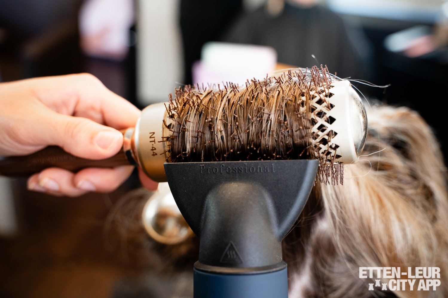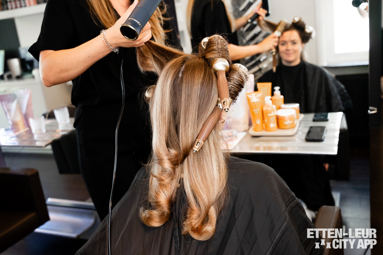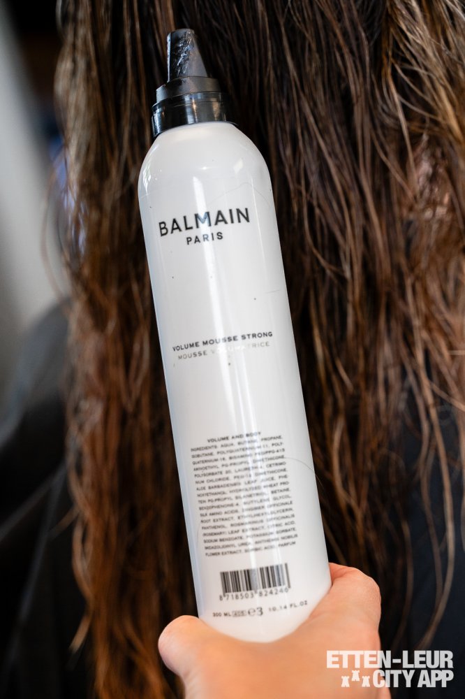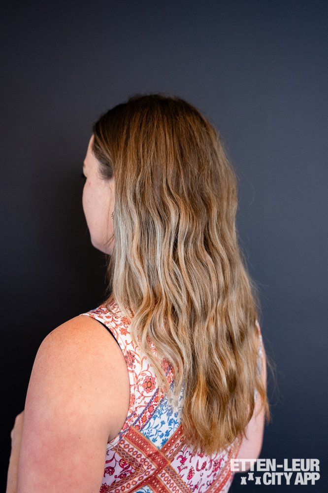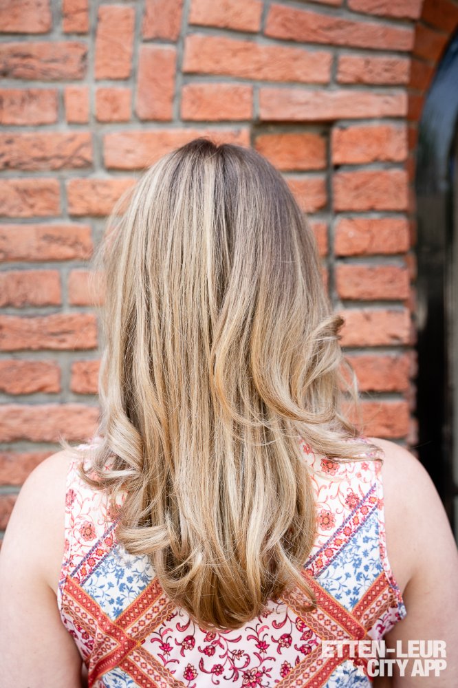 Na de uitgebreide wasbehandeling beginnen we met knippen, föhnen en stylen. We kijken samen naar mijn haarlijnen, wat het gewenste model is en de puntjes worden netjes bijgeknipt. Hierbij worden er verschillende producten gebruikt om het haar te voeden, te verzorgen en te beschermen. Vervolgens wordt het haar in model geföhnt en afgetopt met een mooie krultechniek. Met grote krulborstels worden er grove krullen ingezet, die daarna in een natuurlijke vorm naar beneden vallen. De balayage is subtiel en mooi aanwezig, waardoor het een hele natuurlijke, frisse, nieuwe zomercoupe wordt.