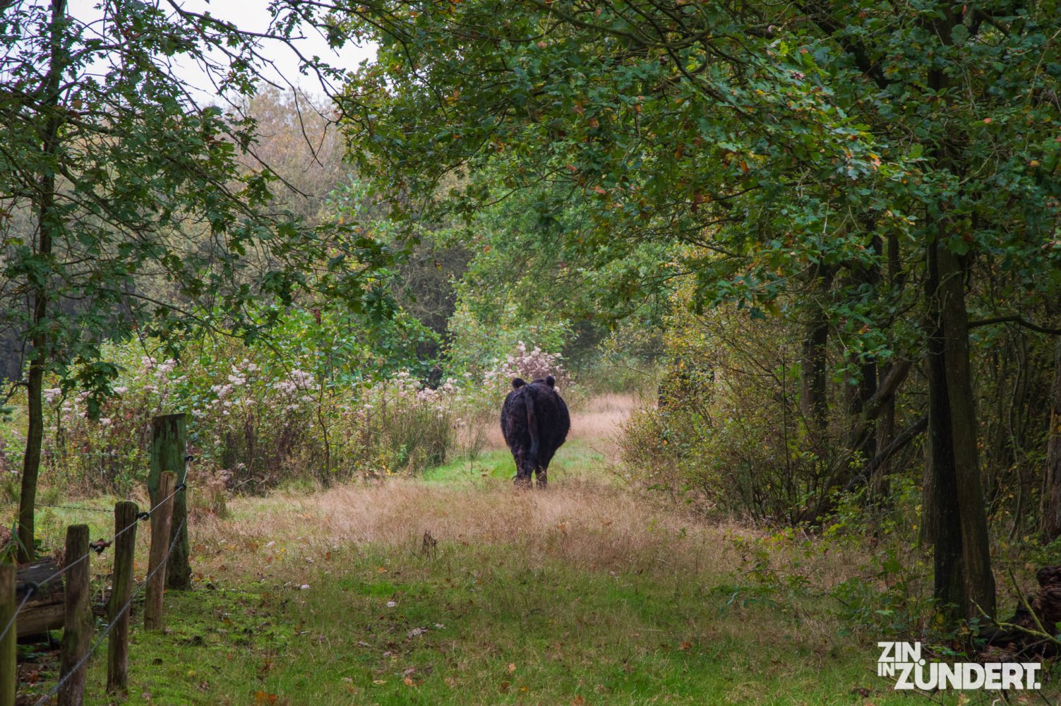 Helemaal alleen zijn we niet in het gebied; halverwege de wandeling zien we een stel runderen op ons pad. Ze maken zich snel uit de voeten als ze ons zien aankomen. Niet veel later passeren we een weiland waar een kudde Konikpaarden op hun gemak staat te grazen.