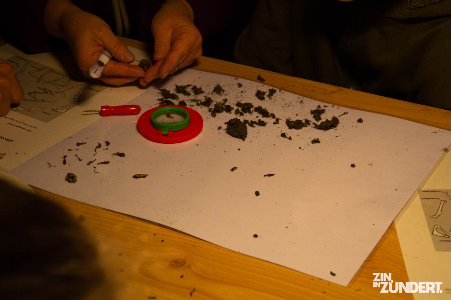 Het is druk in en rondom de schuur. Ook veel gezinnen met kinderen hebben vandaag hun weg naar de Zwarte Schuur gevonden. Tijdens de herfstvakantie vond ook de Week van het Landgoed plaats. Ter afsluiting daarvan zijn er vandaag ook gezinswandelingen georganiseerd. In de Zwarte Schuur wordt er door de kinderen hard gewerkt. Aan een grote tafel knutselen ze beestjes van klei, takken, proppen, bladeren en ander herfstmateriaal uit het bos. Aan een andere tafel is een groepje kinderen druk bezig met het uitpluizen van uilenballen.