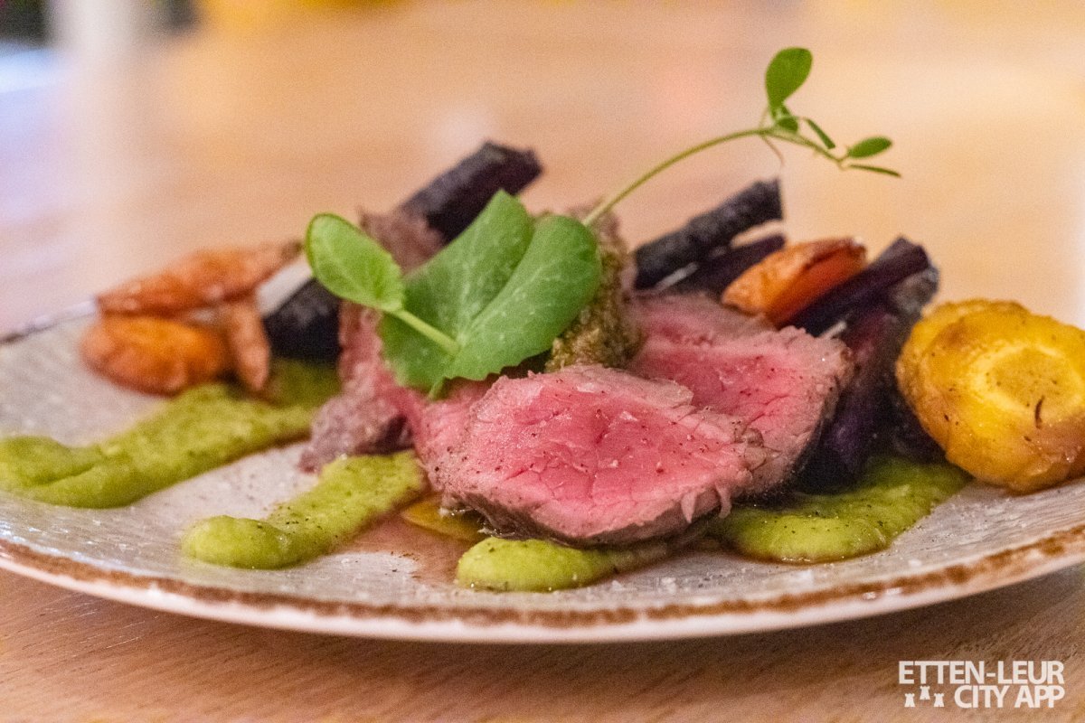 We krijgen het huis aperitief aangeboden. Het is een bubbel uit de Loire, Frankrijk. Een zeer aangenaam aperitief, dat komt door de zachte bubbel en frisse smaak. Terwijl we genieten van deze zachte Franse bubbel bekijken we de kaart. Wat ons op valt is dat ze erg bewust zijn om met streek producten te werken. Zo bezoeken zij de locaties waar hun vlees vandaan komt. Dat geeft een duurzaam, goed en vertrouwd gevoel.