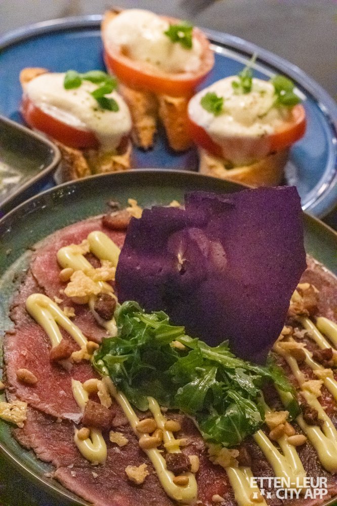We hebben inmiddels onze keuze doorgegeven. We starten met 3 gerechtjes. De carpaccio is licht en subtiel gegrild op de Josper. Hierdoor krijg je geen standaard carpaccio, maar juist een extra smaaksensatie. De bruschetta capresse is een krokante toast met olijfolie en zacht gesmolten buffel mozzarella. De tartaar van verschillende zeevruchten is erg aangenaam en zacht van smaak.