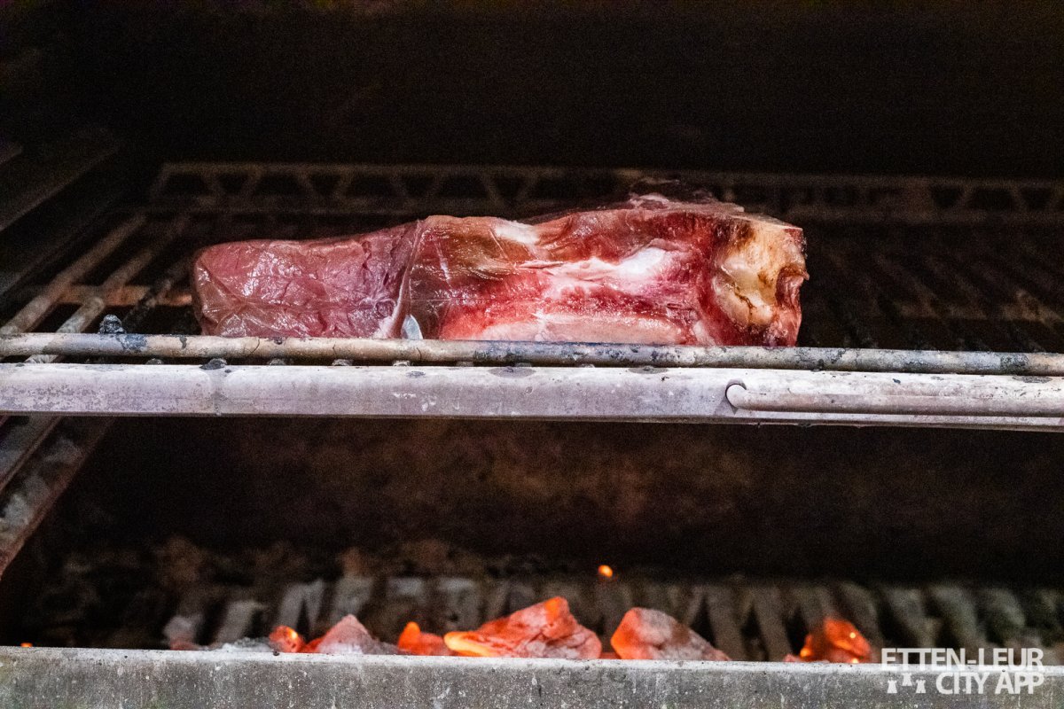 Enthousiast nodigt Sanne mij uit om een kijkje in de keuken te nemen. Ze wijst me op de Côte de boeuf van 1000gram in de Josper. Geweldig om deze manier van bereiding te zien.