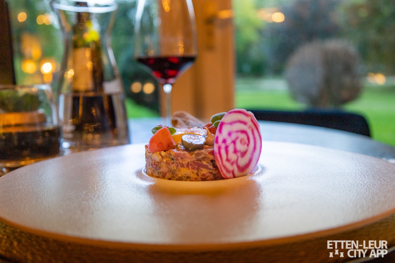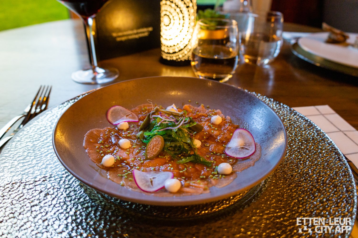 We kozen voor de zalm carpaccio met limoen mayonaise en rode ui met daarbij een steak tartaar met zwarte knoflook, cornichons en sjalotjes.