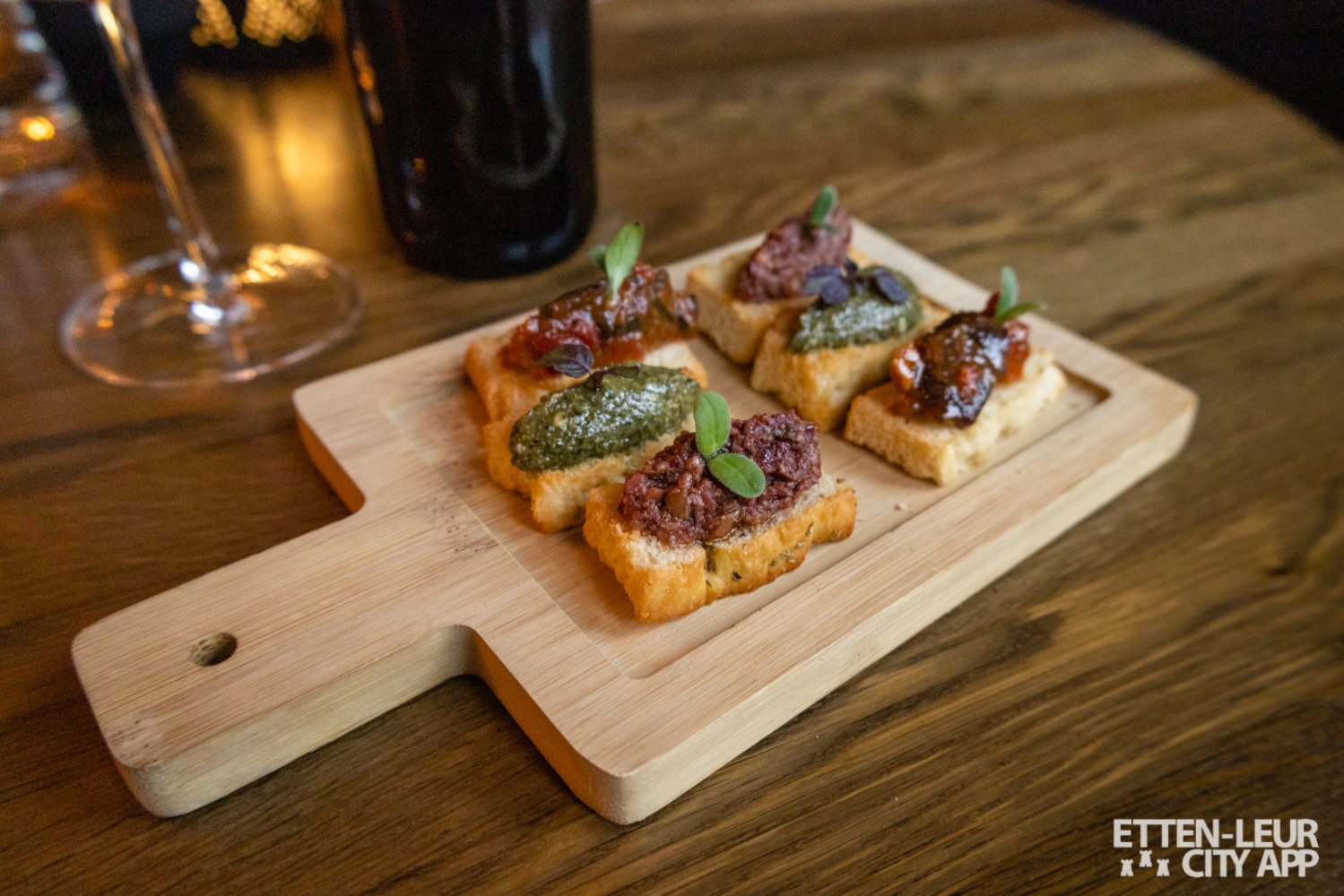 Als aperitief kregen we een mooi opgemaakt plateau met bruschetta's. Pesto, grove groente en tomaten tappenade, alle drie compleet verschillend en erg lekker! De menukaart arriveerde in een schilderij, geheel in thema van Van Gogh, een heel leuk detail.