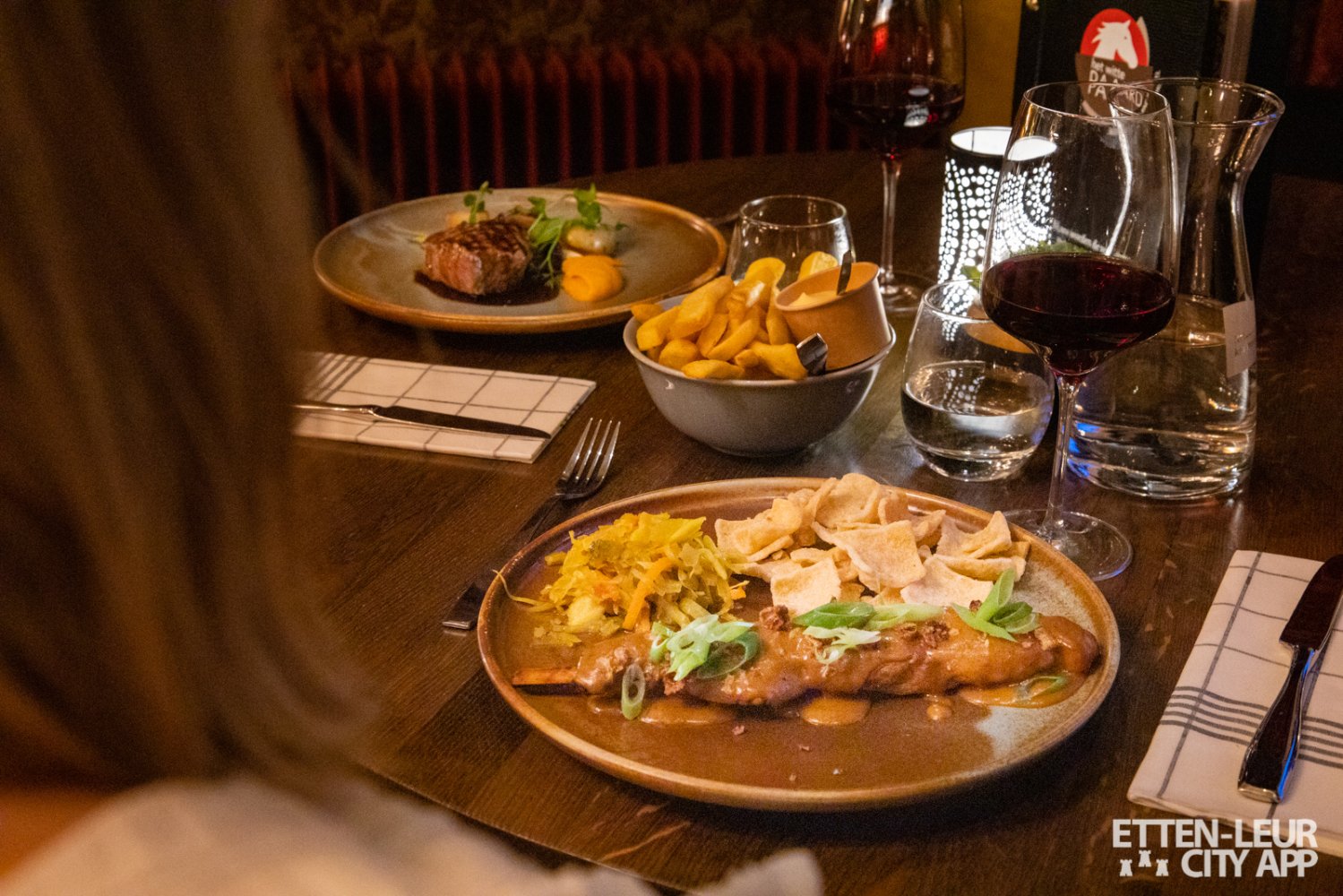 Voor de tweede gang kozen we een entrecote in rode wijnsaus met seizoen groente. De entrecote was medium gebakken en hierdoor lekker mals. De rode wijnsaus gaf het vlees een mooie smaak, zeker in combinatie met de eerder gekozen rode wijn.
