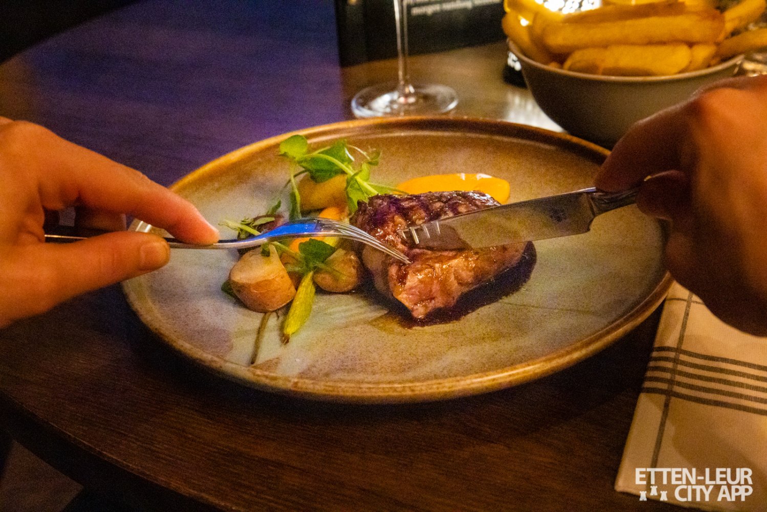 Naast de entrecote kozen we voor een saté van kippendij met pindasaus, cassave, atjar en krokante ui. De zachte kippendij was goed gebakken en de atjar was een frisse afwisseling bij het gerecht. Bij het hoofdgerecht kregen we ook een schaaltje friet met mayonaise om te delen.