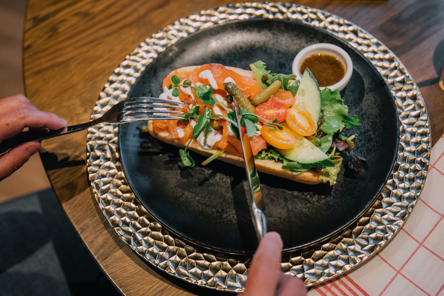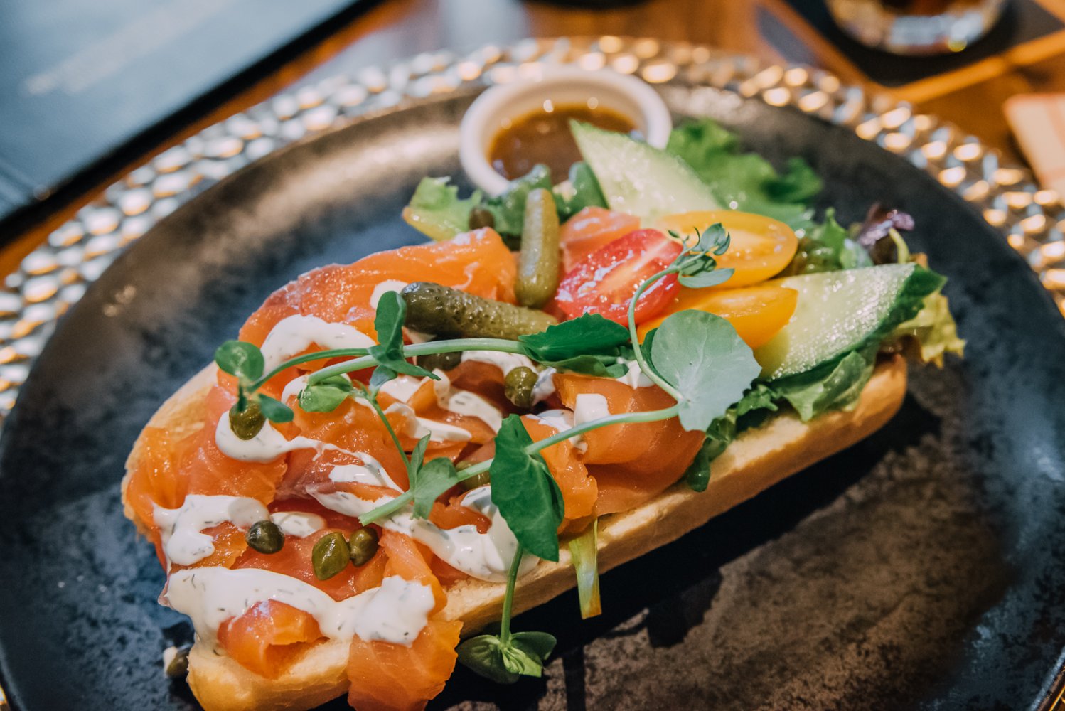 Het broodje wat mijn moeder kiest, is een klassieker: een wit pistoletje Gravad Lax. De zalm zit vol smaak en is lekker vers. Het broodje is afgemaakt met kappertjes, rode ui en een Scandinavische dressing. Ook dit lunchgerecht is rijkelijk belegd en goed vullend. De salade die erbij geserveerd wordt, maakt het gerecht wat frisser. De Scandinavische dressing smaakt erg goed. Uit welke ingrediënten deze dressing bestaat, blijft voor ons een verrassing. Ik zie mijn moeder enorm genieten van dit lunchgerecht en ik weet: we hebben allebei een goede keuze gemaakt!