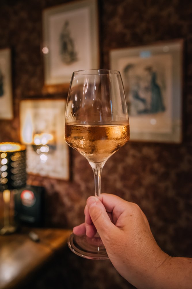 Simon adviseert een wijntje bij de clubsandwich. Hij vertelt trots dat het Witte Paard beschikt over een inpandige wijnwinkel en raadt een rosé aan. Ik krijg een glas Château Gassier Esprite de Gassier Rosé uit Frankrijk. Ik neem een eerste slok en hij rolt zacht over de tong! Simon vertelt kundig dat het een rosé is met een mooie kruidigheid en in de geur rood fruit, peredrups en lychee aroma's. Het is een smaakvolle, frisse rosé die niet te zwaar valt. In combinatie met het rode vlees op de clubsandwich is het een echte aanrader, ik geniet van elke slok!