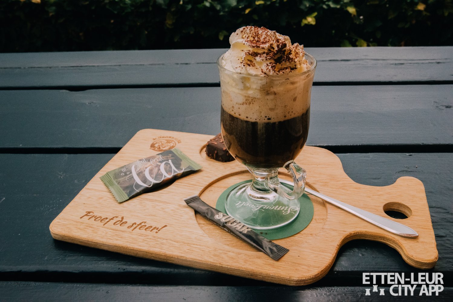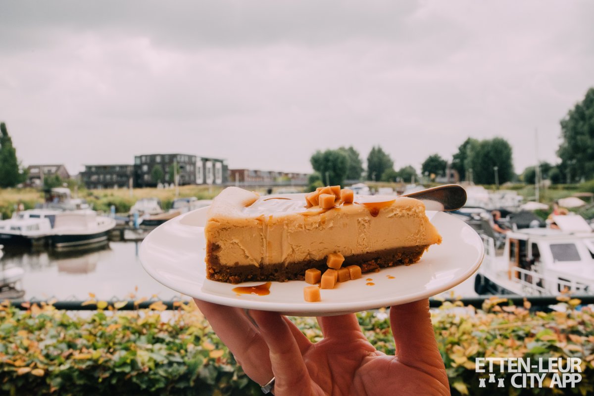 Omdat we zo genieten van het uitzicht over de jachthaven (en hier geen genoeg van krijgen) sluiten we onze lunch af met een verse muntthee, een koffie en een stukje cheesecake to share. De koffie special Turfvaart wordt leuk opgediend en is met de toegevoegde Schrobbeler een heerlijke afsluiter van de lunch.
