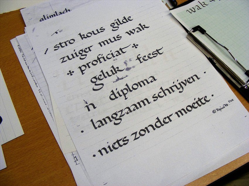 Als vervolg op eerder succesvol verlopen kalligrafie-middagen en de aanhoudende vraag “wanneer weer? “ wordt op zaterdag 12 oktober wederom een workshop Kalligrafie georganiseerd. Deze workshop wordt gegeven door “good old” Regina de Ruiter, een krasse vakvrouw van het eerste uur, die haar sporen reeds verdiend heeft op het gebied van kalligrafie en meerdere malen hiervoor in de prijzen is gevallen. Regina geeft je eerst de grondbeginselen en feedback, nodig om daarna zelf te gaan kalligraferen.