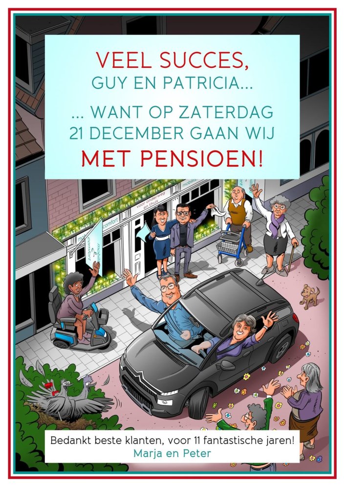 Op de leuke tekening (gemaakt door Stephan Timmers) zie je Guy en Patrica bij de winkeldeur staan en Peter en Marja zitten in de auto klaar om hun pensioen in te rijden.