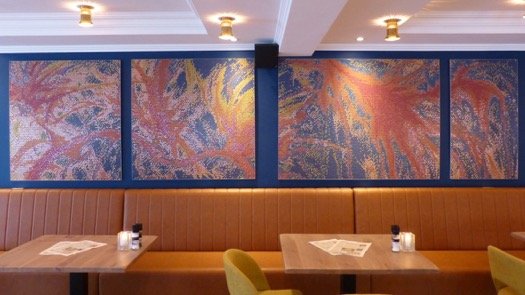 Het Pixelmozaïek “Explosie” van Irene Hemelaar in Vincents aan de Markt in Eten-Leur was nog tot afgelopen weekend te bewonderen. Jaarlijks wisselt de mosaïste er van werk en 24 december werd een 7-luik, genaamd “Inner World” onthuld. Het is weer een kleurrijk werk (met toch stiekem een knipoogje naar Van Gogh). Je bent van harte uitgenodigd om te komen kijken.