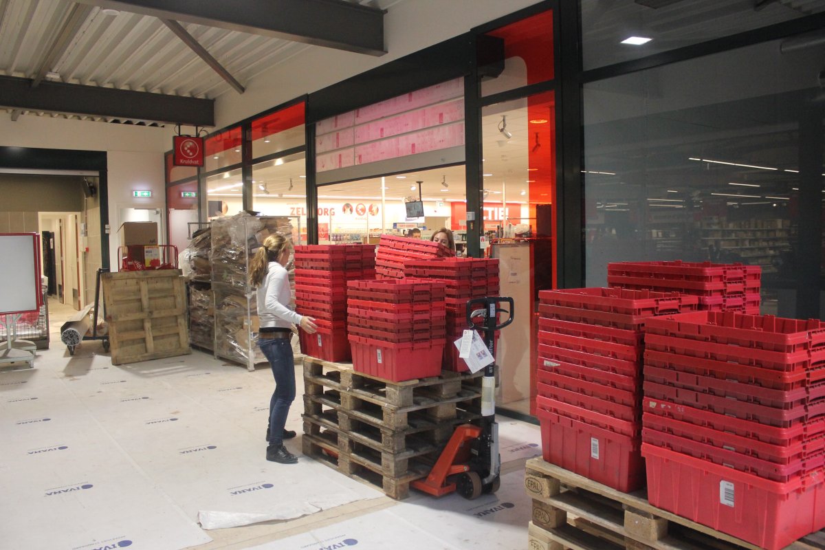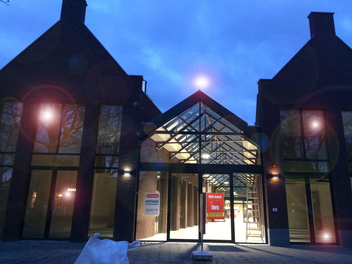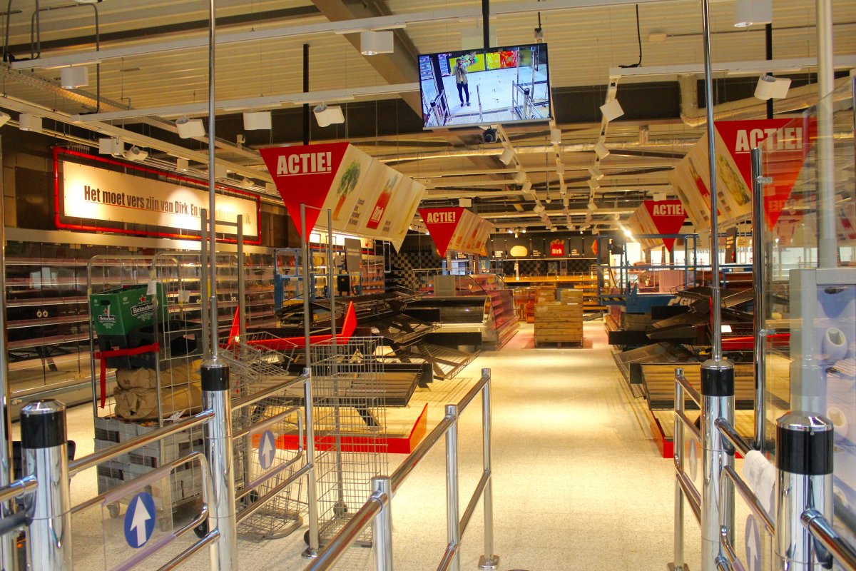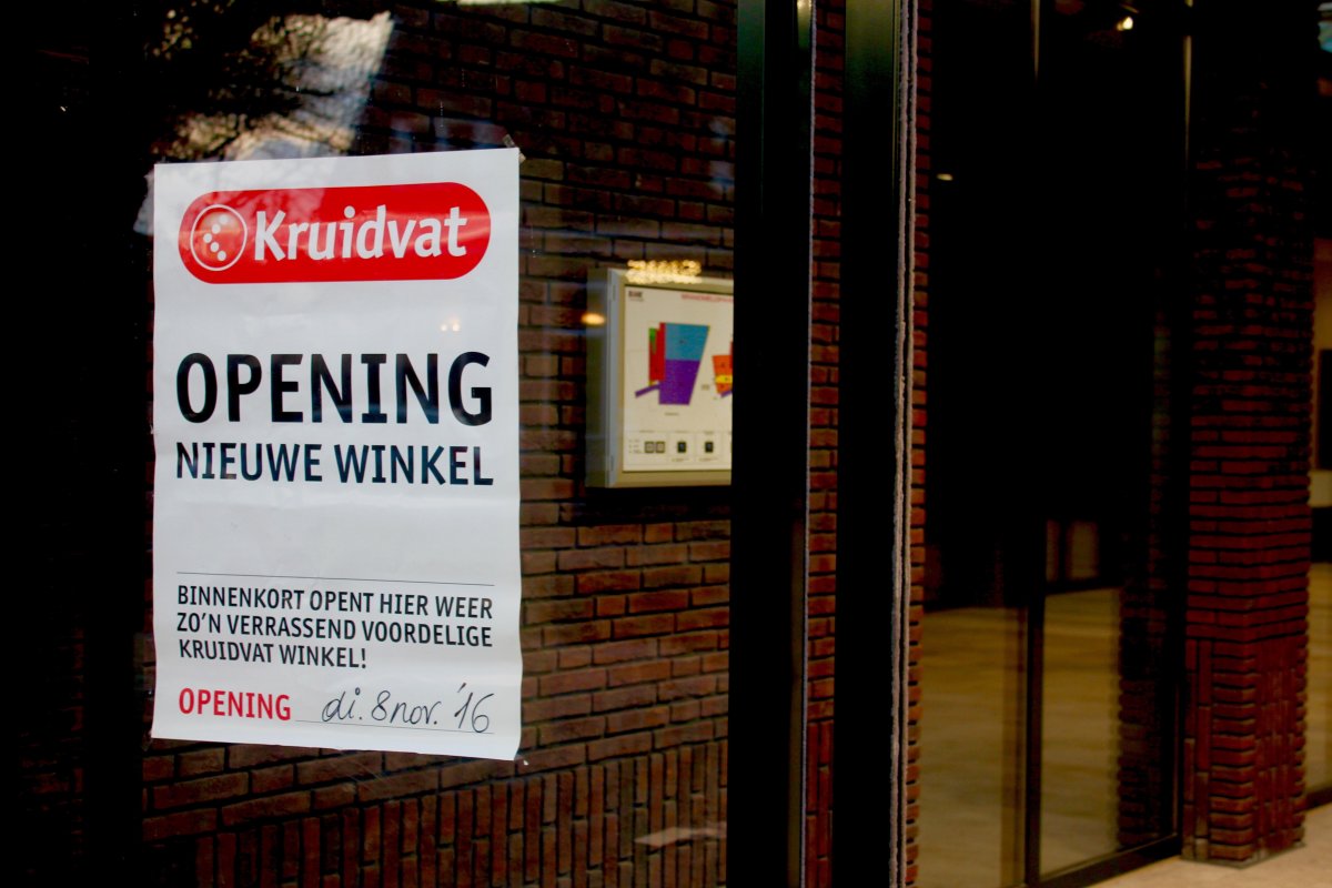 We pakken de trap naar boven, maar vanaf volgende week is het ook mogelijk om met een rolband of de lift naar boven te gaan. Je komt dan midden in de passage uit. En die is ook al zo lekker licht. Links de ruimte waar Bakkerij van Disseldorp komt en rechts groenten- en fruitzaak Beekers. Links achterin dan de grote Dirk. ‘Deze is zeker twee keer zo groot als die aan het Schoonhout en telt ruim 2.000 vierkante meter.’ Rechtsachter tenslotte bevindt zich de nieuwe Kruidvat. Aan de buitenzijde van de passage, met alleen een ingang vanaf de Bisschopsmolenstraat, komt een Van Boxtel Hoorwinkel.