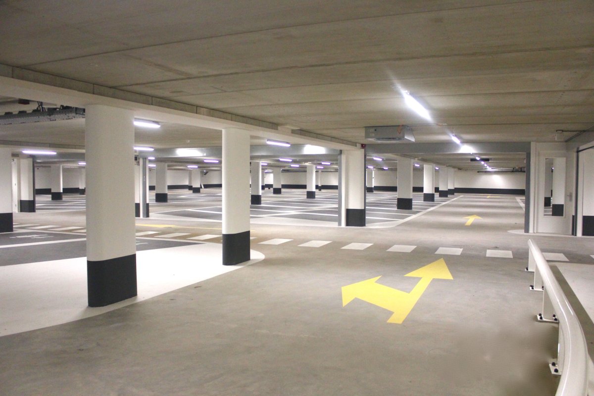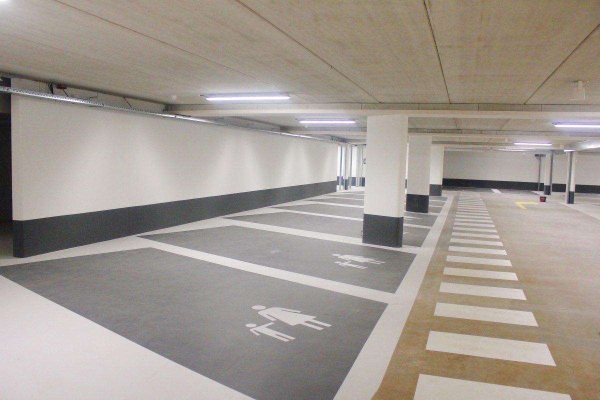 We duiken de parkeergarage in, die rust op maar liefst 300 palen. ’De garage telt 94 ruime plaatsen, voor iedereen toegankelijk, dus niet alleen voor bezoekers van de passage.' Wel is het zo dat Dirk korting geeft op parkeren. Parkeren is het eerste uur gratis bij besteding van 20 euro. Naast de gewone brede vakken, zijn er ook nog eens enkele extra brede vakken. De zogenoemde ouder-kind-vakken. 'Speciaal bedoeld om veilig kinderwagens, buggy’s en maxi-cosi’s in- en uit te kunnen laden. En uiteraard hebben we ook een aantal vakken voor minder-validen.’ Prettig is dat de rijbanen in de garage ook al breed zijn. ‘Er is gekozen voor ruime parkeervakken en een wat hoger plafond dan normaal. Daardoor oogt de kelder heel ruimtelijk en dus vriendelijk. Komt natuurlijk ook doordat alles wit is.’