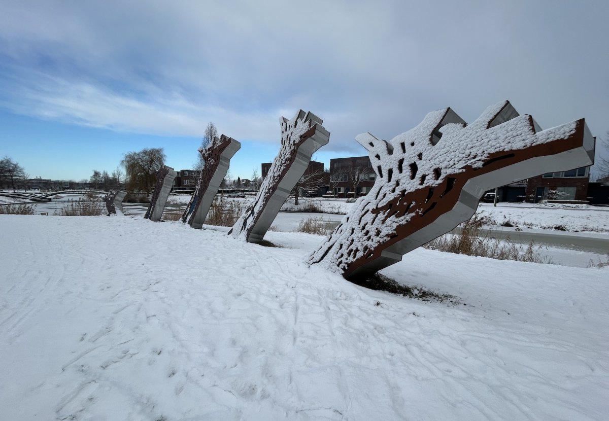 Besneeuwde knotwilgen in het Schoenmakerspark. Vijf stalen bomen langs de kant van het water. Een kunstwerk van Wilhelmus Vlug uit 2024.