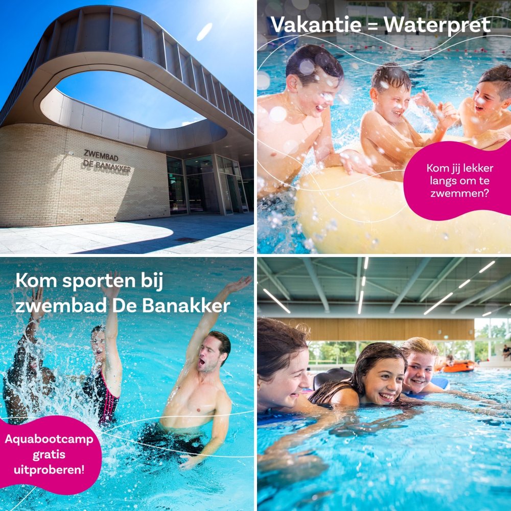 Hou je wel van water, maar liever niet met bakken uit de lucht? Ga dan een dagje spetteren in De Banakker. Tijdens de vakantie kun je hier terecht voor: Vrijzwemmen, Banenzwemmen en Aquasporten, zoals aquarobics, aquafit, aquabootcamp, hydrofit en aquajoggen.