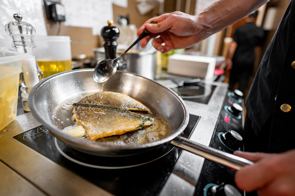 Zo'n 80 procent van de menukaart bestaat uit vis. Uiteraard is er ook aan de vegetariërs en vleesliefhebbers gedacht. Zo staan er op de kaart bijvoorbeeld kaaskroketjes, rib-eye, bief, ribs, maishoen, tournedos en quiche. Voor elk wat wils dus. Maar vis voert de boventoon. Van garnalencocktail tot allerhande schelpdieren, van Schotse zalm tot Bouillabaisse, zeewolf, zeebaars, oesters, kaviaar en kreeft. De keuze is reuze. Je voelt je als een vis in het water...