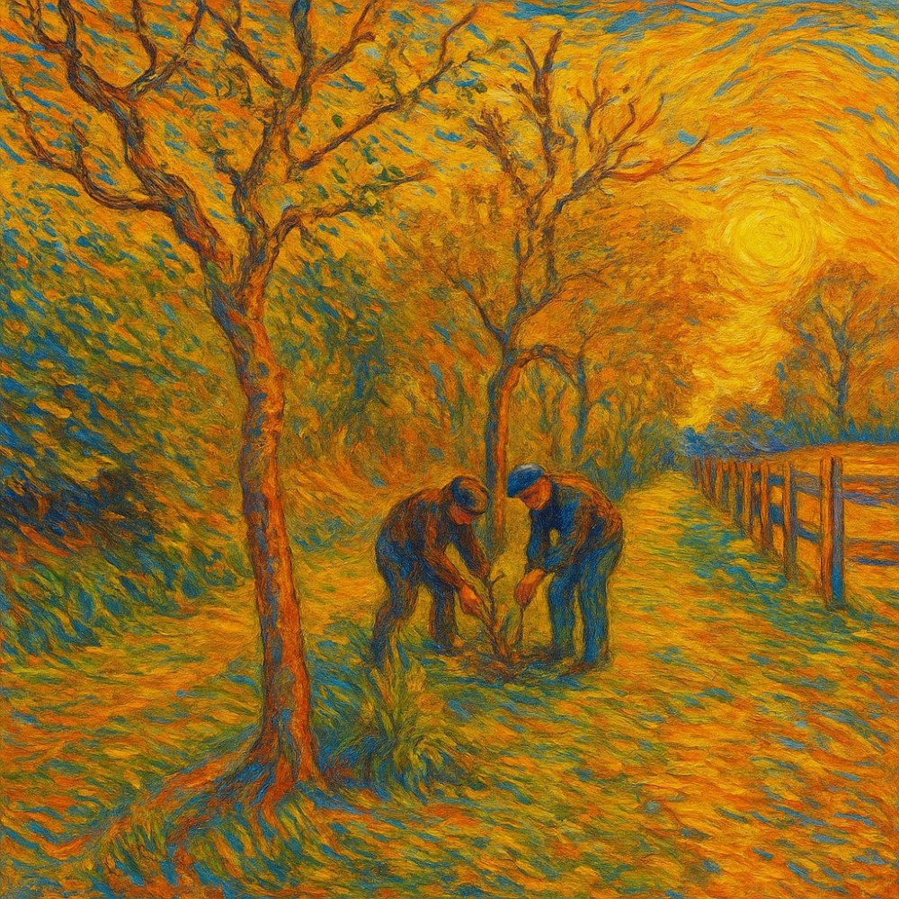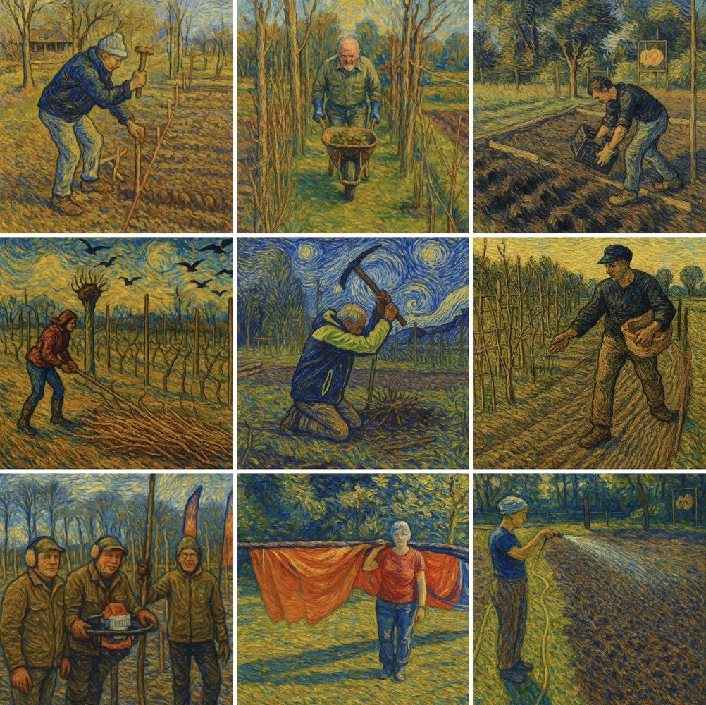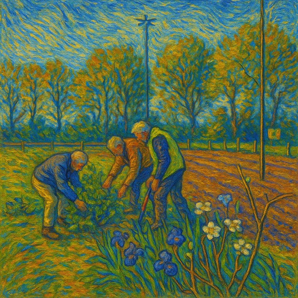 Onder de overkapping bij de paddenpoel is een mini-expositie van vrijwilliger Kees te zien. Op basis van foto's van diverse werkzaamheden op de akker zijn met ChatGPT reproducties in Van Gogh-stijl gemaakt.